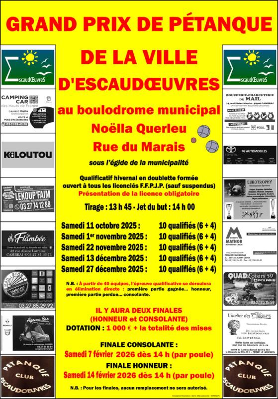 Le Pétanque Club d'Escaudœuvres est composé en deux sections (compétition et loisirs). La première section avec des joueurs licenciés, affiliée à la F.F.P.J.P. Les adhérents peuvent participer aux différentes compétitions officielles (coupe de France, interclubs féminins masculins et vétérans, championnats Nord et Ligue, départementaux, le Grand Prix de la Ville. etc.) pour le côté sportif, ainsi que de participer aux manifestations internes (repas de fin d’année, journée de convivialité) et ont le droit de vote lors de notre assemblée générale. La seconde section (carte d'entraînement) permet de pratiquer notre sport en loisir, surtout pour se détendre et passer un bon moment de convivialité entre amis. Un championnat interne de 10 journées se déroule chaque année avec un prix pour chaque joueurs classés . Le tirage au sort se fait intégralement à chaque tour pour tous les adhérents (licenciés ou carte d’entraînement). Le boulodrome dispose de 32 terrains dont 16 couverts et chauffés.