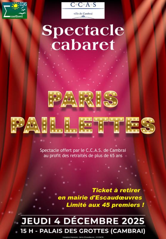 Le Centre Communal d'Action Sociale de Cambrai offre chaque année, à l'occasion des fêtes de fin d'année, un spectacle au profit des retraités de plus de 65 ans. Si vous êtes intéressés et que vous habitez la commune, veuillez venir retirer un ticket en mairie d'Escaudœuvres auprès de Marie-Noëlle. Attention : nombre de tickets limité aux 45 premiers !