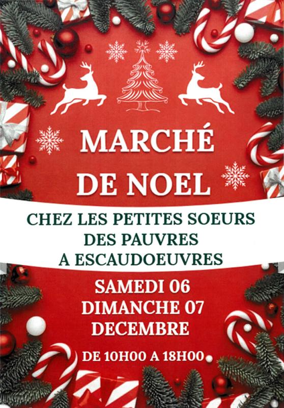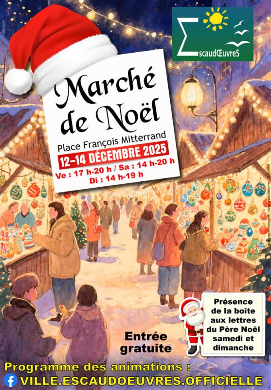 La municipalité d'Escaudœuvres organise ce marché de Noël avec chalets, stand pour le Téléthon, jeux, vente de cases et manège pour enfants. La boîte aux lettres du Père Noël sera présente samedi et dimanche pour recevoir les courriers des enfants. Vendredi : ouverture de 17h à 20h, inauguration à 19h avec petit concert de Noël par l'Harmonie municipale d'Escaudœuvres et chorale de l'A.D.A.P.T. Samedi : ouverture de 14h à 20h avec la présence du Père Noël. Dimanche : repas tartiflette à 12h30 par Arnaud LAINE Traiteur (à réserver au 06.18.65.64.01 avant le 5 décembre), ouverture du marché de Noël de 14h à 19h avec animation Chérie FM par Franck BINET (parade lumineuse, jongleur de feu), balade en calèche et photos avec le Père Noël. Buvette et petite restauration sur place. Entrée gratuite.